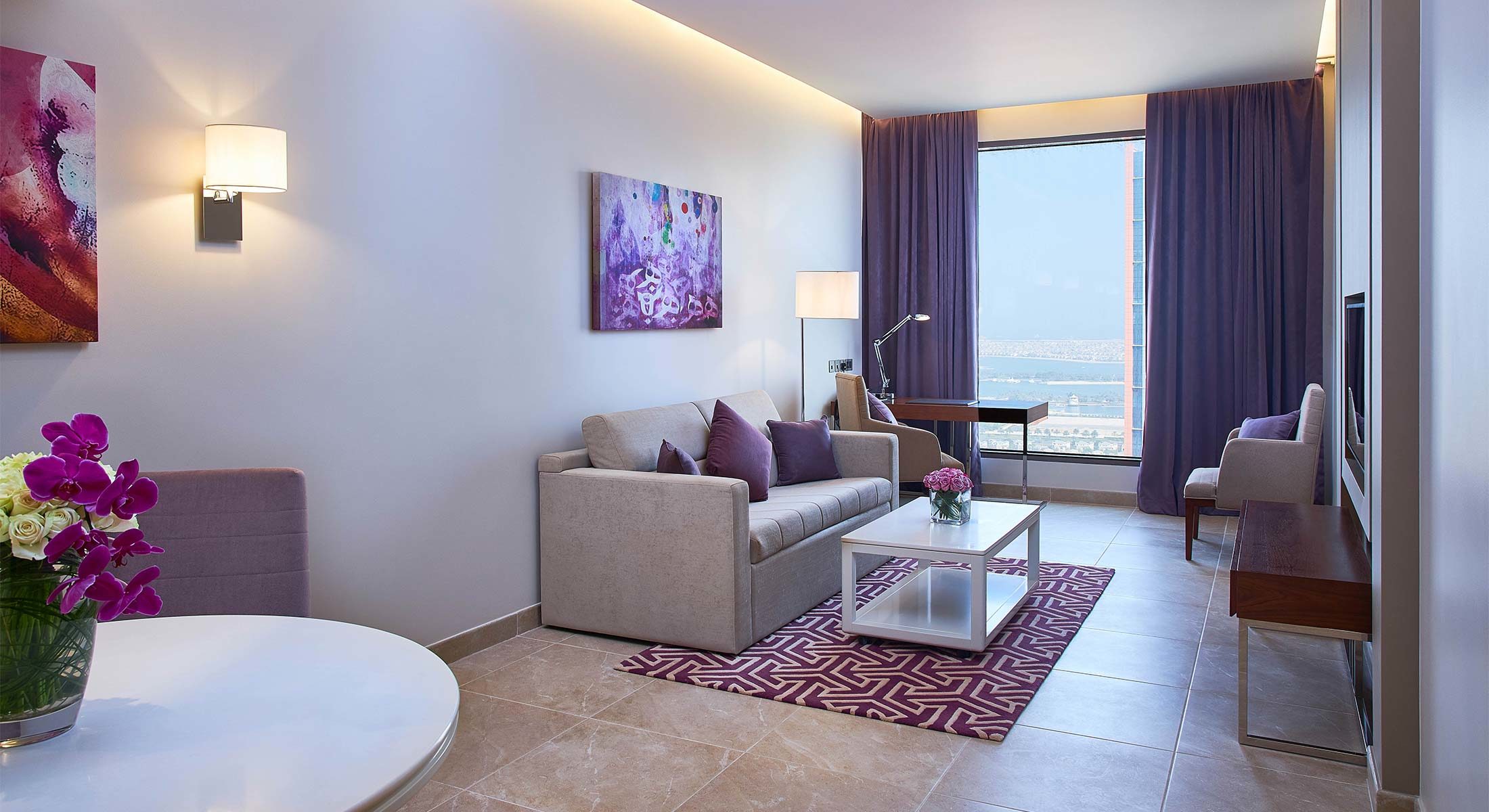 Этот номер площадью 60 квадратных метров с яркими акцентами, прохладной цветовой гаммой и просторной обстановкой сквозит непринужденным изяществом. Он оборудован душем, телевизорами с плоским экраном в спальне и гостиной, принадлежностями для приготовления кофе и чая и отдельным балконом — не исключено, что места лучше не придумать. Но самое главное: за окнами в пол открывается прекрасный вид на шоссе шейха Заида и небоскреб Бурдж-эль-Араб или Дубай-Марину, за которой виднеется море и остров Палм-Джумейра.
